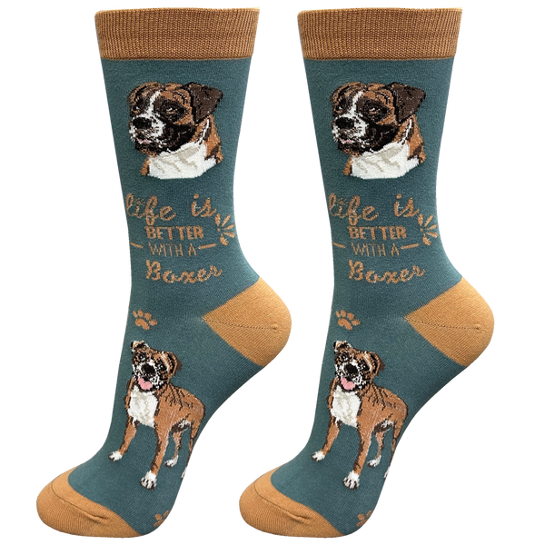 Big image of dog head woven on both sides on the socks and full body image woven at the bottom of the socks with a cute saying that says life is better with Dog.