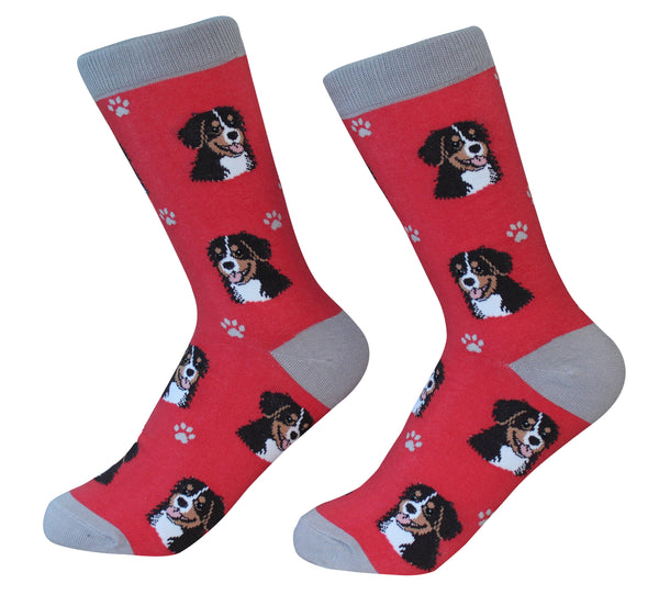 Our Bernese Mountain Dog socks are made from the finest quality cotton. We use 200 Needle count machines to make them while most of the companies only go up to 144 needle count. There are 20 to 24 Bernese Mountain Dog faces woven on each pair of socks. Best of all, these socks are super soft and comfortable and they are machine washable. If you have a Bernese Mountain Dog you have to have a pair of these socks. These socks also make great gifts for anyone in your family and friends.