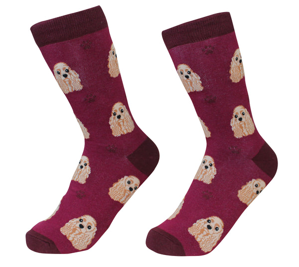 Our Cocker Spaniel socks are made from the finest quality cotton. We use 200 Needle count machines to make them while most of the companies only go up to 144 needle count. There are 20 to 24 Cocker Spaniel faces woven on each pair of socks. Best of all, these socks are super soft and comfortable and they are machine washable. If you have a Cocker Spaniel you have to have a pair of these socks. These socks also make great gifts for anyone in your family and friends.